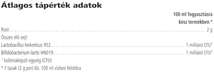 - Adagonként 2 milliárd élő baktériumot tartalmaz a Bifidobacterium lactis-ból és a Lactobacillus helveticus-ból